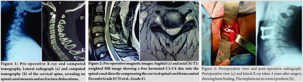 A 23-year-old wrestler sustained a cervical spine injury during the wrestling competition on March 15, 2008. He suddenly became paralyzed and was immediately taken to the hospital emergency department. He had no previous burners and stingers syndrome history or any significant medical history. On neurological examination, the neck was stiff. Deep tendon reflexes of both upper (bicipital and tricipital) and lower (patellar and Achilles) extremities were absent. Pathologic reflexes (Hoffman, Wartenberg, and Babinski) were negative. Bulbocavernosus reflex was negative. Anesthesia below C4 dermatome was present in bilateral upper and lower extremities. He was quadriplegic with no sensory or motor function preserved in sacral segments S4-S5. He showed Grade 0 muscle weakness of bilateral legs and below top of the shoulders. Pre-operative conventional radiographs (Fig. 1a) and computed tomography (CT) (Fig. 1b) of the cervical spine revealed no spinal canal stenosis and no fracture dislocations. Sagittal (Fig. 2a) and transversal (Fig. 2b) T1- and T2-weighted magnetic resonance images showed a free herniated cervical disc severely compressing the spinal cord from central at C3/4 level and no bleeding of the retropharyngeal space. Urgent surgery was performed. He underwent anterior cervical discectomy, interbody fusion using autologous iliac crest graft (AICG), and ventral stabilization using cervical plate (Fig. 3a). The patient was operated5 h post-injury. Adjuvant pre- and post-operative steroid was administered; he was put on methylprednisolone sodium succinate (Solumedrol 40 mg/2 ml) injection 2 times a day for 10 days. The patient was immobilized postoperatively with a rigid cervical collar for 3 weeks. The incision was with primary healing. Rehabilitation was systematic thereafter for 12 months. Radiographs of the cervical spine 3 years after surgery showed satisfactory bone healing (Fig. 3b). His neurological palsy gradually improved postoperatively. 6 months after surgery, he could walk without crutches. 5 years later, he was competing at high level.