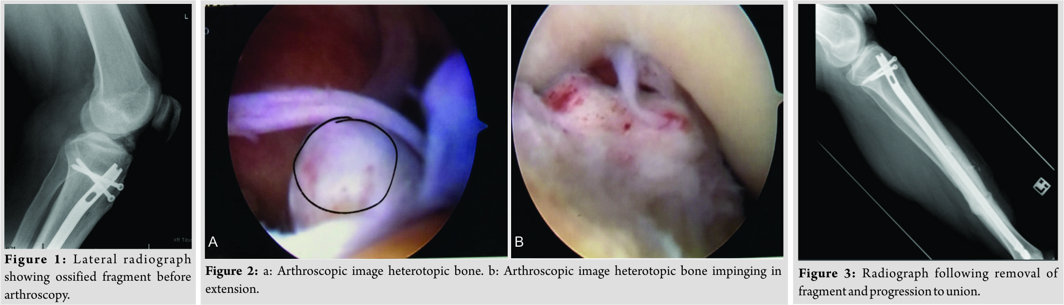 Case Report: A 27-year-old male, having sustained a left, Gustilo IIIB tibial shaft fracture following a motor vehicle accident, underwent a reamed intramedullary nail fixation performed through a suprapatellar approach. Two months later, he presented with intra-articular heterotopic ossification which was limiting his knee movement. He then underwent arthroscopic removal of the bony fragments which resolved his symptoms.