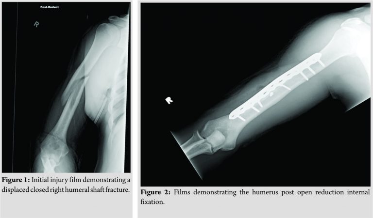 A 20-year-old male athlete who had been complaining of a dull achy pain in his right deltoid region sustained a displaced closed right humeral shaft fracture following a throw in a baseball game (Fig. 1). He was seen at a local hospital after the injury and was placed in a coaptation splint. On initial examination, gross motor and sensation were intact. To rule out malignancy, an magnetic resonance imaging was obtained which did not demonstrate any pathological lesions. In an effort to speed recovery and maintain maximal function, he underwent ORIF. An anterolateral approach to the humerus was made, and the fracture was reduced and compressed using a large fragment plate and screw construct (Fig. 2).