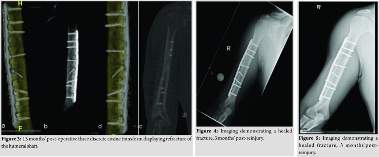 Six weeks following the surgery, the patient began to jog and lightly throw a baseball. He began light weight lifting and continued home PT to strengthen the elbow and shoulder. By 3 months’ post-operative, the fracture had united. The patient returned to college baseball 6 months postoperatively. Eleven months following the fracture repair and 5 months following return to baseball, the patient felt a “pop” with immediate pain in the posterolateral aspect of his right arm following a throw. Radiographs of the right humerus revealed two new fracture lines. A computed tomography scan confirmed anew spiral fracture of the midshaft of the humerus extending from the second proximal screw to the lag screw. The hardware remains intact, and there is no evidence of hardware failure or loosening (Fig. 3). Vitamin D levels were obtained and were found to be low. The patient’s 25-OH Vitamin D level was found to be 24.3 ng/mL, while the reference range was 32.0–100.0 ng/mL. His serum calcium was within normal limits, at 9.5 ng/mL. In addition, a thyroid function panel was within normal limits. The thyroid panel was obtained, to rule out hyperthyroidism, as this can lead to secondary osteoporosis. The patient was, therefore, started on Vitamin D, given a one-time dose of 50,000 U followed by 2000 U daily. The patient was placed in a sling, for 1 month, following refracture. The patient began physical therapy 3 weeks following the refracture. Initial therapy consisted of numerous stretching activities in addition to using resistance bands for shoulder and elbow range of motion exercises. Throughout the recovery process, he attended therapy 3 times a week. The patient had full shoulder and elbow range of motion at 4 weeks’post-refracture. At 3 months’post-reinjury, the fracture appeared to be healed (Fig. 4). He was cleared for light sporting activities at 3-month post-reinjury. At this time point, the patient began throwing exercises at this time with the collegiate baseball athletic trainer. He began performing four sets of 10 throws, from a distance of 60 feet. The intensity of throwing at this time was 50% of full strength. He performed throwing exercises 3 days a week. After 2 weeks of these throwing exercises, he began six sets of 10 throws with each set having an increase of intensity by 5–10%, where he had perform his last set at 85% of maximum throwing strength. 2 weeks into his therapy, he also began to perform the following weight training, in three sets of 10 repetitions: Seated rows, lat pull downs, and tricep extensions. The patient continued to exercise and work with the college’s athletic trainer. After 3 months of working with physical therapy and the collegiate athletic trainer and at 6 months following re-injury, he was back to throwing at 100% intensity. He gradually increased throwing distance and weight training over 4 months of therapy. He continues to take 2000 U of Vitamin D3, once a day. Today, he is 1 year out from the recurrent stress fracture and is throwing a baseball at 145 feet with original pre-injury intensity. He finished his senior year of college back on the baseball field, as his teams start catcher. Imaging of his humerus at 1 year post-recurrent stress fracture is demonstrated in (Fig. 5).