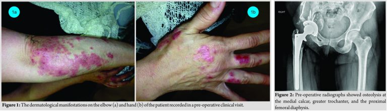 Utilizing the ETO, the prosthesis was exposed and using a combination of flexible osteotomes, gigli saws, and implant removal instruments. The stem was removed with minimal bone loss (Fig. 4d). The hip was revised utilizing a Stryker Restoration (Stryker Inc., Kalamazoo, Michigan) revision stem (Fig. 5a and b). The stem is made of titanium alloy (Ti-6Al-4V) and we used a 36 +2.5mm ceramic head (Biolox delta Ceramic Femoral Head, CeramTec, Lauf, Germany). Postoperatively, the patient progressed well. By her 2-month follow-up visit, she reported complete resolution of her skin rash (Fig. 6). Her Co level was 3.2 mcg/L and her Cr was 4.3 mcg/L at 3 months postoperatively. At 6 months postoperatively, she stated her ability to think had improved. She healed her ETO without issue. 15 months after surgery, she noted subtle improvement regarding her POTS symptoms and remained symptom free with respect to her rash and mentation. She did, however, still have residual hip pain, attributable to a greater trochanter fracture nonunion, and she had persistent lower extremity paresthesia.