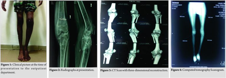 A 55-year-old gentleman, presented with complaints of pain over the left knee joint and inability to weight bear over his left leg for the past ten 10 months. The patient was apparently normal 10 months ago, when he had a history of slip and fall from 10 feet height at his workplace in the month of January 2017 and sustained close injury to his left knee. The patient developed pain and inability to weight bear over his left leg. The patient initially underwent native splinting for 6 months following the injury. As patient was not relieved of his symptoms following native splinting, patient came to Sri Ramachandra Medical College Porur for further management With complaints of pain, deformity, and unable to bear weight on left leg (Fig.1). There is no history of fever, loss of appetite or any other bone injury. The patient is not a known case of diabetic mellitus, Hypertension hypertension cardiac disease tuberculosis asthma epilepsy. The patient is not a smoker or an alcoholic. Examination revealed left lower limb appears to be shorter than the right lower limb. Muscle wasting was noted over the thigh and calf region. Healed abrasion scar present over the anterior aspect of the knee joint and the distal aspect of the leg. Dilated veins present over the posterolateral and the medial aspect of the knee joint. No popliteal fossa fullness was noted. Tenderness present over medial and lateral jointline Swelling present over the anterior aspect of knee joint. Bony mass is palpable over the anteromedial and lateral aspect of the knee. Broadening and thickening present over the anterior, medial, and lateral aspect of the knee joint. Abnormal mobility was noted. The Range range of Movement movement of the knee was 20 to –70°° with fixed flexion deformity of 20°.Further movements were painful. There was no neurovascular deficit noted.