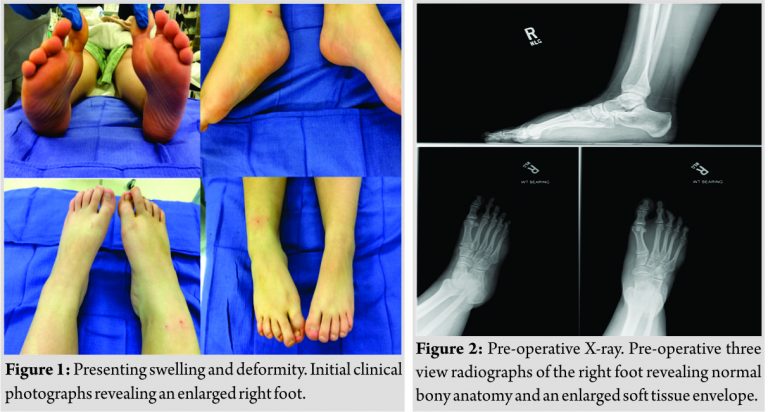 A 12-year-oldotherwise healthy female presented with enlarged right foot with crossing over of her second toe to her hallux with weight-bearing, as well as significant pain at her second and third proximal interphalangeal (PIP) joints of approximately 6-month duration. She reported a resting pain in the toes of three to six and pain with ambulation and exercise of eight to 10 on a visual analog scale (VAS). Pain was most pronounced with weight-bearing and running and becoming progressively less tolerable for the patient over time. The enlargement had been present since birth requiring a shoe size larger than the contralateral. Non-tender enlargement was noted on all aspects of her right mid and forefoot with the second and third hammer toe deformities (Fig. 1). In addition, the third PIP was subluxed with pain on range of motion.