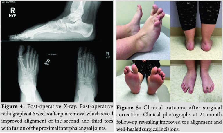 There was concern that a debulking procedure would have significant risk of nerve or vascular injury with substantial scar formation. As the hammer toe deformities and pain were the primary complaint, the attending surgeon suggested surgical management in the form of metatarsophalangeal joint release with extensor tendon lengthening and flexor to extensor tendon transfers without addressing the hypertrophy. In addition, the second and third PIP joint arthrodesis was performed to prevent deformity recurrence. The patient was made non-weight-bearing in a soft dressing. Sutures were removed at 2 weeks and pins removed at 6 weeks at which time the patient was allowed to weight bear as tolerated in a supportive shoe. At 4-month follow-up, the patient was pain free with no complaints and she was able to bear weight, ambulate, and complete her activities of daily living without issue (Fig. 4.). At 21-month follow-up, the patient was very satisfied with her toe positions and reported a decrease in pain on VAS to a resting level of zero and level of zero to three with prolonged activity, including running, which localized to the second and third digit (Fig. 5).