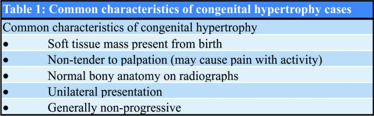 Congenital hypertrophy is a rare disorder with nine previous cases reported in literature. Although these cases have similarities, it is impossible to know whether or not each of these cases represent the same pathology and some reports would tend to suggest some variation in presentation. There are, however, some common characteristics shared by most cases presented (Table 1).