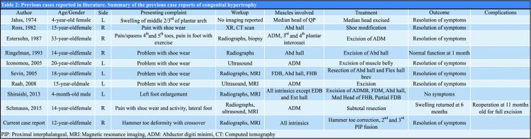 The disorder has been documented in ages 4 months–33 years of age, has occurred in seven females and two males, and has occurred in equal rates in the left and right feet. Patients tend to present with foot asymmetry and varying degrees of pain or functional impairment, but the most common complaint has been difficulty with normal shoe wear. Each case has occurred in the absence of any other known congenital syndromes or disorders. Of the nine reported cases, five report hypertrophy of an isolated muscle belly (abductor hallucis in two cases [6,10], abductor digiti minimi (ADM) in two cases [4,5], and one case of isolated median head of the quadratus plantae [2]. The remaining four cases reported hypertrophy involving multiple muscle bellies. There is, uniformly, a visible, compressible soft tissue mass (Table 2). The youngest case reported by Shiraishi et al. of a 4-month-old boy was discovered due to an obvious size discrepancy between the child’s normal left foot and significantly larger right foot, although it was apparently asymptomatic [8]. Among the other reported cases, a majority reported that the soft tissue mass was non-tender to palpation (six of eight reports). Five cases reported that the mass had been present since birth [3,4,6,8,9], two reported that the mass had enlarged over a range of 7 months–10 years [7,9], and the remainder did not specify.