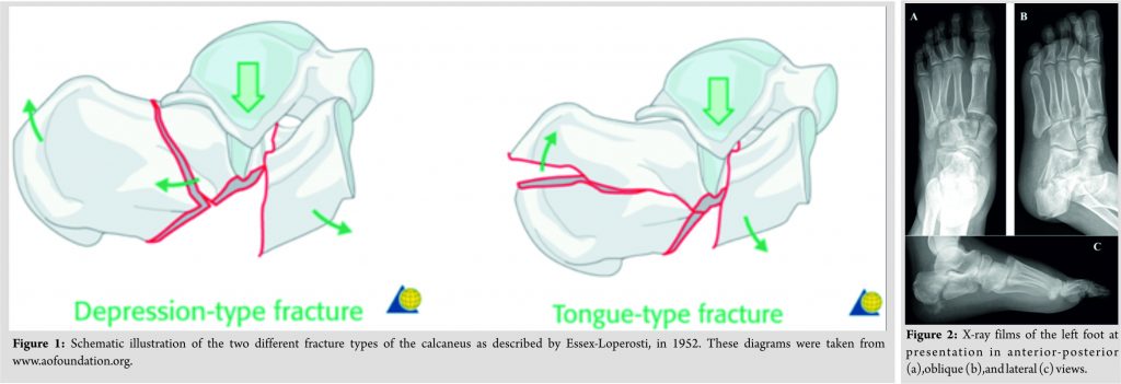 Introduction: Calcaneal fracture is the most common foot fracture. It occurs due to an axial load and is associated with high morbidity, especially when the articular surface is involved. There are two types of calcaneal fractures: Joint depression type and tongue type. The latter has a high risk of skin necrosis and should be operated on promptly.