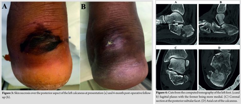 Case Report: This is a 37-year-old Bangladeshi man who sustained a comminuted calcaneal fracture and a Lisfranc fracture of the left foot. Initial radiograph showed a joint depression-type fracture, excluding a surgical emergency. Nevertheless, the patient developed skin necrosis over the posterior aspect of the heal that improved after open reduction and internal fixation of the calcaneus. Pre-operative computed tomography (CT) scan demonstrated a bony fragment that was displaced posteriorly causing the skin necrosis.