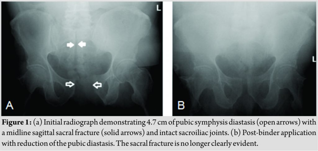 - 6. Carter TR, Lambert K. Pubic diastasis with longitudinal fracture of the sacral body: Case report. J Trauma 1990;30:627-9. [Google Scholar]