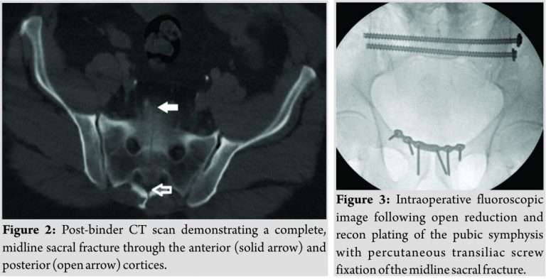 This case demonstrates a rare variant of the anterior-posterior pelvic injury, with complete posterior pelvic disruption by means of a midline longitudinal sacral fracture. The initial assessment and treatment of these patients should follow advanced trauma life support. During the course of any necessary resuscitation and provisional pelvic ring closure, it is imperative to examine and document any neurologic dysfunction. Classically, Zone III sacral fractures are associated with a high risk of neurologic injury. However, consistent with our patient’s case, midline longitudinal variants in Zone III appear to have a lower incidence of neurologic injury. These fractures require thin-slice CT scans for a thorough multiplanar understanding of the involved structures. It is well accepted that significant anterior pubic diastasis should be addressed with operative fixation. However, the midline longitudinal sacral fracture pattern has been reported as both stable and unstable following anterior fixation. We recommend anterior pelvic fixation first, with subsequent intraoperative fluoroscopic evaluation to document any increased or residual displacement that may suggest instability of these unique sacral fractures. If the anterior sacral body alone appears wide, but an intact posterior hinge provides adequate stability, posterior fixation may not be necessary. However, if the posterior midline sacral fracture further gaps following acceptable anterior pelvic reduction and fixation, this is evidence that the sacrum is unstable and requires posterior fixation. Although treatment varies on a case by case basis, appropriate identification and treatment of these rare sacral fractures arenecessary to prevent complex deformities and progressive loss of neurologic function [10].