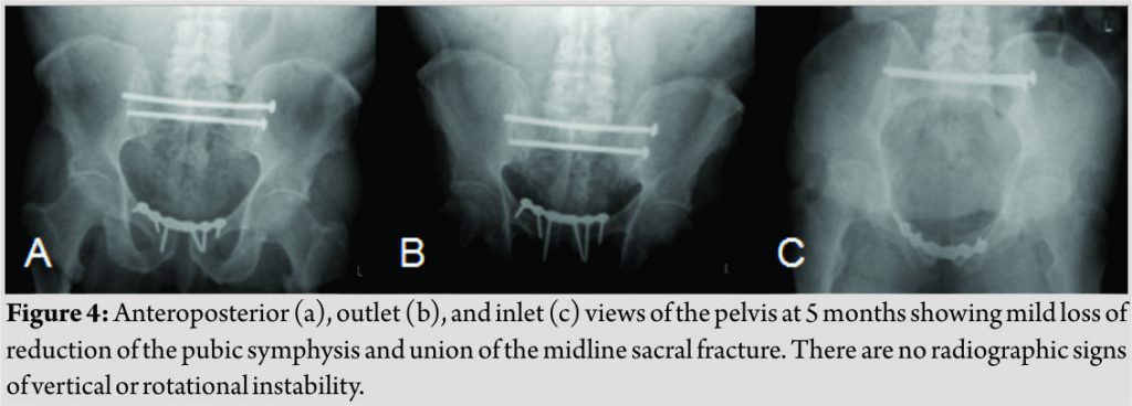 During reduction and fixation of the anterior pelvis, intraoperative fluoroscopic assessment revealed increased widening of the midline longitudinal sacral fracture. Due to the fracture’s involvement of the posterior sacral elements and subsequent axial plane instability, fixation of the sacral fracture was deemed necessary to prevent further displacement and potential symptomatic deformity. Under fluoroscopic guidance, transsacral-transiliac guide pins were then used to insert 7.3mm fully threaded screws into the S1 and S2 body, measuring 150 mm and 140 mm, respectively. The screws were inserted posterior to the iliaccortical density so as not to injure the L5 nerve root. Using lag-screw fixation technique principles, these screws closed down the midline sacral fracture diastasis and anatomic reduction was achieved. Postoperatively, the patient was mobilized to weight bear for transfers. At 10 weeks, he began weight-bearing as tolerated. The patient developed post-operative urinary retention and a Foleycatheter remained in place on hospital discharge. The urology team followed him as an outpatient and the catheter was removed at 1 month, at which time he was able to pass urine normally. The patient received routine follow-up evaluations. Sacral fracture union was evident at 5 months with only mild loss of reduction at the pubic symphysis (1.3 cm of diastasis) (Fig. 4). He had persistent impotence with otherwise normal urologic function and no neurologic deficits.