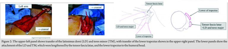 Specific differentiation between injury to the upper trunk brachial plexus injury and combined injury to the suprascapular and axillary nerves is often difficult [4]. In patients with injury to the upper brachial plexus, the suprascapular and axially nerves are typically targeted in the reconstruction of shoulder function, especially shoulder external rotation and abduction. Improving external rotation is necessary for the recovery of shoulder function in activities of daily living for patients with a suprascapular nerve palsy [5]. The surgical treatment of chronic suprascapular nerve injury in patients having the potential for recovery of rotator cuff function has not been previously reported. Transfer of the spinal accessory nerve to the suprascapular nerve is a popular treatment in these cases. However, a primary nerve graft or transfer has been recommended to restore shoulder function in patients with a suprascapular nerve injury. Exploration of the suprascapular nerve over its entire length is essential in these cases due to the possibility of several points of the nerve damage. The nerve graft must be performed within the first 3-month post-injury to restore good shoulder function [6,7,8]. Baltzer et al. reported that a clinically meaningful recovery of shoulder function following a nerve transfer performed at 1-year post-surgery was achieved in only 33% of cases of the traumatic brachial plexus injury [9]. In our case, the patient presented with an incomplete paralysis, with the possibility of spontaneous neural recovery. As such, we chose to monitor recovery of neural function over a period, which delayed the timing of the salvage procedure; the salvage procedure was ultimately performed in the late phase postoperatively. Elhassan et al. were the first in 2009 to report a surgical transfer of the middle and lower portions of the trapezius to restore shoulder external rotation in a patient who had sustained a brachial plexus injury with complete paralysis of the deltoid, infraspinatus, and teres minor. The transferred tendon was lengthened using an Achilles tendon allograft for fixation at the infraspinatus insertion [2]. In a subsequent report, Elhassan et al. recommended the transfer of only the lower portion of the trapezius, using a tibialis posterior tendon allograft or hamstring autograft, as an alternative option to an Achilles tendon allograft, to prolong the tendon [10]. Although the transfer of the lower portion of the trapezius to the infraspinatus provides functional recovery of shoulder external rotation, it is insufficient to improve shoulder flexion and abduction. Therefore, additional tendon transfers are required[1]. In our case, due to the poor recovery of contractile strength of the deltoid muscle, we included transfer of the LD and TM, using tensor fasciaelatae graft to the insertion of the supraspinatus tendon, which improved the muscle strength of shoulder elevation and abduction. Bonnard et al. stated that the final strength of the deltoid was better when grafting of the axillary nerve was carried out within 5–6 months of injury to the axillary nerve. They also noted a decrease in success rate of the procedure with increasing age, which might be related to a decreased capacity for nerve regeneration with aging. [8] Post-operative recovery was unremarkable, with excellent improvement of the ROM. Although our procedure is useful to improve function, it would be impractical in cases in which the terminal branch of spinal accessory nerve must be used as a nerve transfer. Nevertheless, the transfer of the lower trapezius for the suprascapular nerve palsy in an early stage without the trial of the nerve transfer may be adapted as one choice. Considering the favorable recovery of shoulder function post-surgery, multiple muscle transfers might provide an appropriate treatment option for both chronic rotator cuffs dysfunction and suprascapular nerve injury in patients in whom early functional recovery is anticipated.