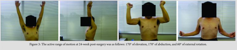 The patient had begun active and passive elbow range of motion(ROM) at 2-day post-surgery, passive shoulder ROM at 2-week post-surgery, and active shoulder ROM at 4-week post-surgery. After gradual decrease of abduction angles of the airplane splint in 2 weeks, the splint was removed at 6-week post-surgery. 9-week post-surgery, an active range of 110°of the shoulder elevation, 75°of abduction, and 15°of external rotation was achieved. At 12-month post-surgery, the muscle strength of shoulder elevation and external rotation had recovered to M3/M4, and the patient had returned to his activities of swimming and water jet skiing. At 24-month post-surgery, the patient had recovered 170° of shoulder elevation, 170° of abduction, and 60° of external rotation. Moreover, muscle strength of external rotation had recovered to M4 (Fig. 3), with a Hand20 score of 13, compared to 30.5 preoperatively.