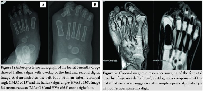 The subject of this case report is a 6-month-old boy referred for evaluation of bilateral hallux valgus. He was the result of a full term, uncomplicated pregnancy and weighed nine pounds at birth. No family history of bone or joint problems was reported. No other medical issues were noted other than penile torsion. The parents reported that the deformities have been present since birth and believe that they have progressively worsened. On physical examination, no dysmorphic features were observed. Each great toe deviated laterally and crossed under the lesser toes at the level of the metatarsophalangeal joints. The first metatarsal head was prominent bilaterally with subsequent blistering and callus. The great toes were flexible in the sagittal plane, but not in the coronal plane. He appeared to have mild discomfort associated with passive range of motion of his great toes. Weight-bearing films of the feet demonstrated hallux valgus deformity bilaterally. The right foot had an intermetatarsal angle(IMA) of 18°with a hallux valgus angle(HVA) of 62°. The left foot had an IMA of 13°and an HVA of 50° (Fig. 1). Amagnetic resonance imaging (MRI)was subsequently performed to evaluate for additional abnormalities that may be contributing to the foot deformities. A bicondylar metatarsal head reminiscent of a forme fruste of preaxial polydactyly without supernumerary digit was evident on MRI (Fig. 2).
