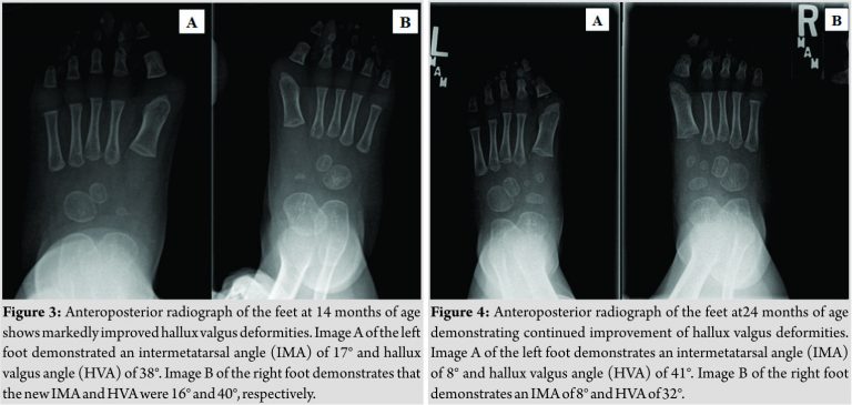 The apparent duplication of the cartilaginous metatarsal head favored a diagnosis of polydactyly. Treatment was offered consisting of splinting of the feet and lower extremities with close follow-up and, if there was no improvement overtime, excision of the redundant metatarsal head with closing wedge osteotomy of the distal metatarsal. The family declined any treatment including bracing. At 14 months of age, the subject was pulling to stand and cruising. The overall appearance of his foot had improved with a drastic decrease in overlap of the second and first toe. He had no difficulty with shoeing or other clinical problems. Imaging demonstrated an overall improvement in alignment. The right IMA had improved to 16°with an HVA of 40°. The left IMA hadactually worsened radiographically to 17°, but the HVA had improved to 38°(Fig. 3).