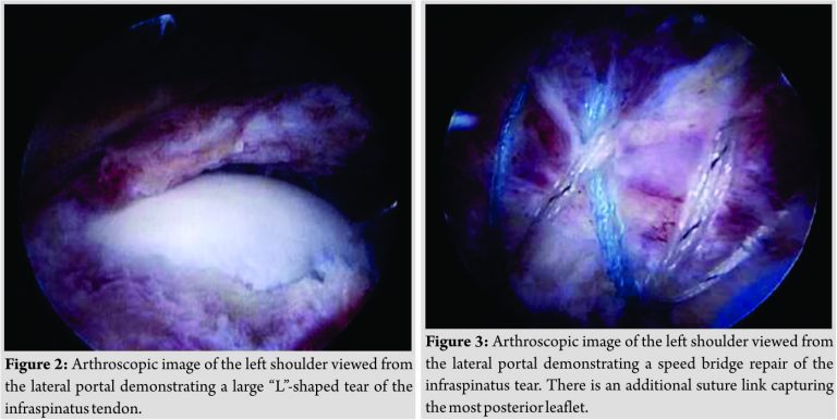 MRA (Fig. 1 A and B) demonstrated a full-thickness tear of the infraspinatus with minimal retraction. The supraspinatus and subscapularis were intact. No biceps or labral pathology was identified. After discussing options with the patient and his family, the decision was made to proceed with arthroscopic rotator cuff repair. Ten days after sustaining his injury, the patient was taken to the operating room. Preoperatively, the patient received an interscalene block and general endotracheal anesthesia was administered. The patient was then placed in the lateral decubitus position with 10 pounds of traction applied to the shoulder. A standard posterior portal was created and a 30° arthroscope was inserted into the glenohumeral joint. Copious hemarthrosis was evacuated from the joint. The anterior labrum, superior labrum, biceps, and subscapularis showed no evidence of injury. A full-thickness tear of the infraspinatus was confirmed while viewing from the articular side. Visualization from the lateral portal confirmed the massive mid substance “L”-shaped tear of the entire infraspinatus tendon (Fig. 2). A knotless, speed bridge double-row construct was performed to repair the tendons after debridement of the free tendon edges and tendon footprint. Two 4.75 mm SwiveLock anchors loaded with Fiber Tape (Arthrex, Naples, Florida [FL]) were placed just lateral to the articular margin, one anterior and one posterior on the footprint. The tape-type sutures were passed in a horizontal mattress fashion through the tendon. An additional Fiber Link (Arthrex, Naples, FL) was passed through the most posterior aspect of the infraspinatus tendon. The lateral row was then created with two additional 4.75 mm SwiveLock anchors (Arthrex, Naples, FL). Visualization from the lateral portal confirmed an excellent restoration of the tendon to the footprint following repair (Fig. 3).