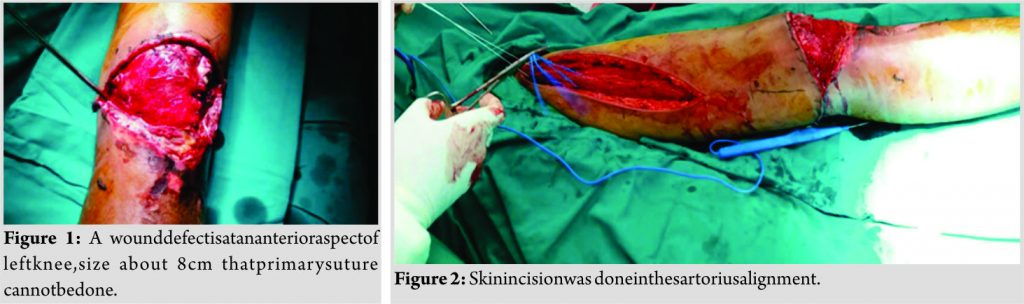Introduction: The coverage of soft-tissue defects around the knee joint has many reconstructive techniques depending on the size, location, and depth. We report a case with large soft-tissue defect at anterior knee joint that primary closure cannot be done with successfully used distally based sartorius flap and full-thickness skin graft to cover this defect.