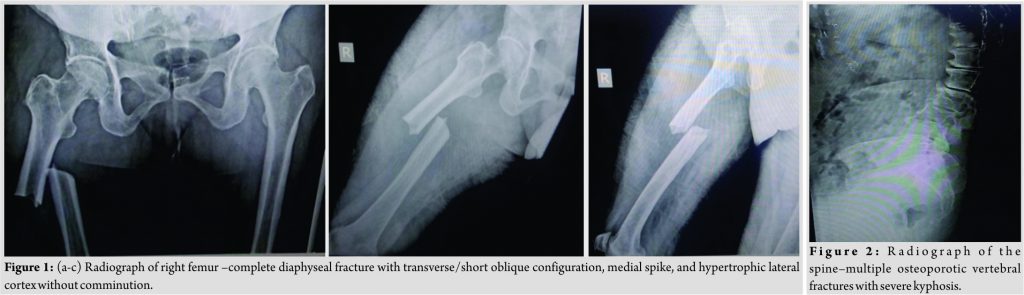 A 73-year-old lady with no history of previous trauma presented to our trauma center with a history of sudden onset pain over the right thigh after a jerk while getting up from a chair. The patient gave the history of seropositive rheumatoid arthritis and osteoporosis with compression fractures of vertebrae for which she was on disease-modulating antirheumatoid drugs and bisphosphonate (Anti-resorptive) medications. The patient also received a dose of denosumab 60 mg subcutaneously 2 weeks before the incident. On admission, the radiographic examination of right femur showed complete fracture at the diaphyseal level of transverse/short oblique configuration without comminution with a medial spike and concomitant hypertrophic lateral cortex (Fig. 1a, b, c). Radiograph of the spine showed multiple osteoporotic vertebral fractures with severe kyphosis (Fig. 2).