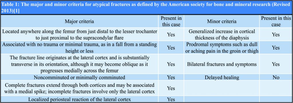Atypical femoral fractures (AFF) are being reported at an increasing rate in recent literature. Etiology of these fractures is not well understood, but it has been reported to occur in patients who have been on a prolonged course of bisphosphonate administration for osteoporosis [1,2] and excessive femoral bowing [3,4]. The diagnosis follows major and minor criteria, which were originally described by the Task Force of the American Society for Bone and Mineral Research in 2010 and updated in 2013 [1]. The features of AFFs are location mainly in the subtrochanteric region and diaphysis; the lack of trauma history and comminution; and a transverse or short oblique configuration (Table 1). Furthermore, the definition discriminates complete fractures with typical medial spikes from incomplete fractures involving only the lateral cortex, correlating with the site of the highest biomechanical stress. Minor features include radiological signs such as periosteal reaction and increased cortical thickness, prodromal symptoms, bilateral occurrence, and delayed healing. Various surgical treatment options have been described for incomplete and complete AFFs. Intramedullary fixation is the preferred method in most cases [5,6,7], while plate fixation is useful in cases of excessive femoral bowing[8] and revision surgeries. We report a case of bilateral AFFs who was on prolonged bisphosphonate treatment, successfully treated with intramedullary nailing. This case highlights intramedullary nailing as a minimally invasive method of treatment of these fractures leading to earlier mobilization and reducing the hospital stay. This case also highlights the importance of identification of prodromal symptoms such as thigh pain and distinct radiological features of incomplete AFF of the contralateral femur.