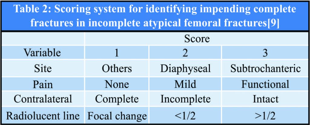 Min BW, Koo KH, Park YS, Oh CW, Lim SJ. Scoring system for identifying impending complete fractures in incomplete atypical femoral fractures. J Clin Endocrinol Metab 2017;102:545-50. [Google Scholar]