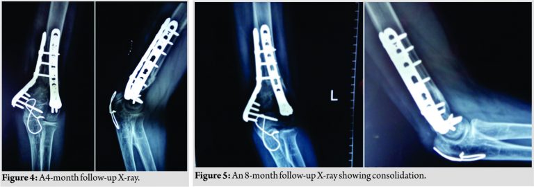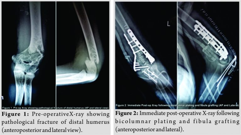 A 16-year-old student was brought to the emergency with a history of trivial fall following which he developed pain and swelling in his left distal arm. X-rays showed a fracture of distal humerus with a lytic lesion involving the distal third of the humerus (Fig.1).Hematological and biochemical investigations were normal. The arm was initially stabilized in a U slab and the patient was taken for fixation in routine OT. Under general anesthesia, the patient was placed in lateral position. Posterior midline incision was taken from distal third of humerus to proximal ulna. Ulnar nerve isolated and olecranon osteotomy was performed to expose the fracture site in distal humerus. A cavity filled with homogenous grayish-white nodular membrane was found. Entire cavity was curetted and the tissue removed was sent for histopathological examination. Fracture margins were freshened. Fibular graft was harvested from the ipsilateral lower limb. The cavity was filled with fibular strut graft. Fixation of the fracture was done with bicolumnar plating (lateral column – posterior and medial column – medial). K-wire tension band wiring was done for olecranon osteotomy (Fig. 2).