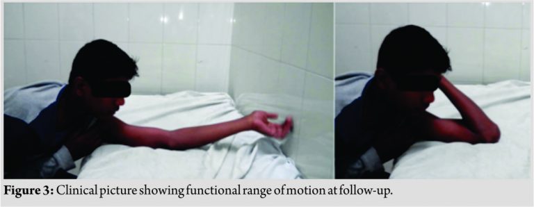 Wound closed in layers. The limb was immobilized in above elbow slab. Post-operative period was uneventful. Suture removal was done after 2 weeks. Passive-assisted elbow range of motion was started at 2 weeks as per pain tolerance. Active range of motion was started after 4 weeks. Histopathology report confirmed the diagnosis of SBC. The patient had good functional range of motion at 4 months (10–130) (Fig. 3).