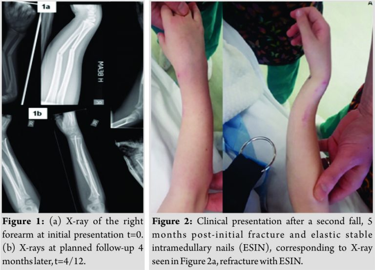 Conclusion: Closed reduction of a refracture of pediatric forearm with ESIN in situ is an acceptable approach to this unusual injury. Caution must be taken intraoperatively and postoperatively to account for any biomechanical deficiencies in the ESIN resulting from the forces applied to cause the refracture and forces applied to the in situ nails to achieve correction intraoperatively.