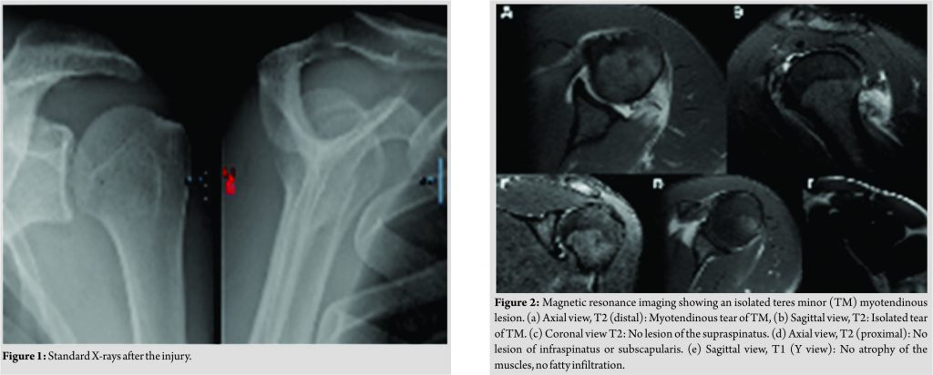 Despite the fact that it is considered the “forgotten muscle,” the important role of the teres minor (TM) is now well known [1]. In a healthy shoulder, it is responsible for 20–25% of the external rotation strength including more than 50% when the arm is abducted [2,3]. Moreover, in case of a massive cuff tear, TM tends to hypertrophy to compensate for the loss of the other tendons (especially the infraspinatus [IS]). It becomes then solely responsible for active external rotation and essential to maintain shoulder balance [4,5]. If a TM lesion commonly occurs in association with a rotator cuff tear, it remains a rare phenomenon (<1%) [6]. On the other hand, an isolated TM tear (without any other rotator cuff lesion) is even rarer and has only been described once before. Indeed, Zaman and Syed reported a case of isolated TM avulsion from its humeral insertion that was repaired arthroscopically [7]. To the best of our knowledge, an isolated myotendinous tear of TM has never before been described. Here, we present an original case of an isolated TM lesion at the myotendinous junction in a young athlete, which was treated early by open surgery with a clinical follow-up of 2 years and a post-operative magnetic resonance imaging (MRI). The patient was informed that his case would be submitted for publication as a case report and provided consent.