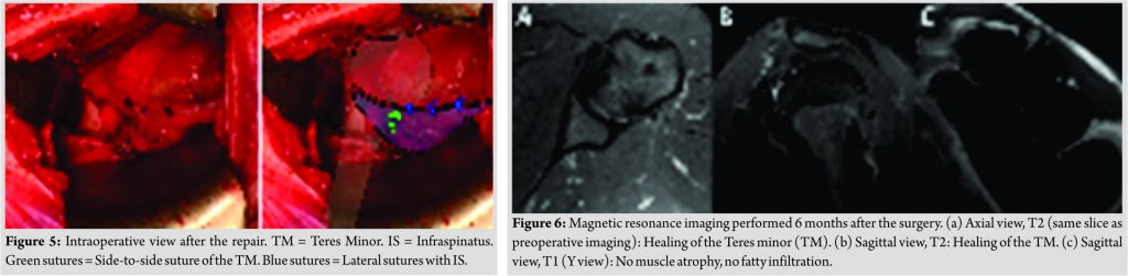 The procedure was performed under general anesthesia in a lateral position, through a posterior approach and the arm in a 70° elevated position. The 8-cm skin incision was done along the posterior border of the deltoid, which was anteriorly reclined. The posterior cuff was easily visualized. The myotendinous tear of the TM was confirmed, as well as the integrity of the IS (Fig. 4).There was no opening of the joint and the articular capsule was not torn. We created a simple side-to-side suture between the medial and lateral parts of the muscle. We completed the repair by placing three lateral sutures between the TM and IS to close the interval between the two muscles (Fig. 5).