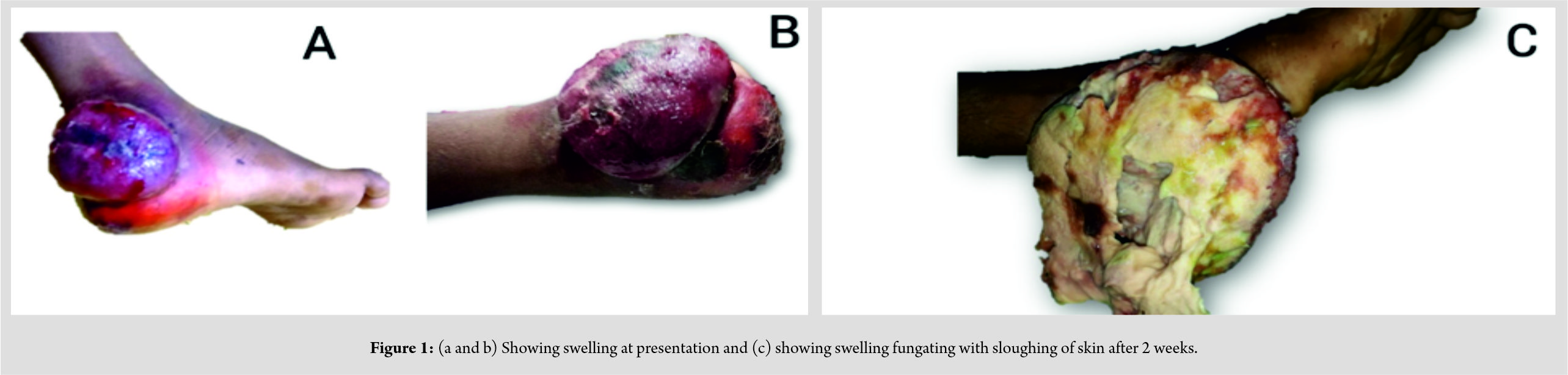 A 7-year-old male child presented with swelling and pain in the outer aspect of the right heel for past 1 month. Mother of the child correlated the swelling with a history of trivial trauma. The swelling was gradually progressing. A history of incision and drainage of swelling by a local practitioner after 5 days of onset of swelling was noted. There was an associated history of high-grade fever of insidious onset, intermittent in nature with chills and without any diurnal variation. Constitutional symptoms such as significant weight loss, loss of appetite, and malaise were present for the past 2 weeks. He was unable to walk or weight bear due to pain in right lower limb for the past 1 week. The patient was febrile and having tachycardia at presentation. No lymphadenopathy was detected clinically. A swelling of 5*4*2 cm size which was tender was present over the posterolateral aspect of heel extending anteriorly covering lateral malleolus, posteriorly extending to the area of tendoachilles insertion to the calcaneus, superiorly 5 cm above whole of the lateral malleolus, and inferiorly 2 cm above the heel (Fig. 1). It had an irregular surface, well-defined round margins with loss of skin cover in more than 50% of the surface area with reddish brown color. There was active oozing of blood from the superior and inferior edge of the swelling. Temperature around swelling was raised. Lateral malleolus was not separately palpable from swelling. Tendoachilles could be separately palpable. Ankle motion was restricted and painful with no distal neuro deficits.