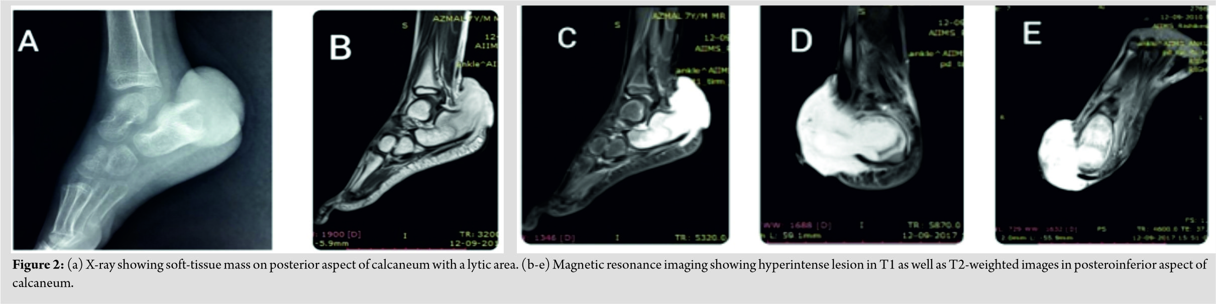 X-ray showed large soft-tissue shadow over heel with loss of soft-tissue planes and a lytic lesion over the posterior aspect of the calcaneus with destruction of the posterior tuberosity of calcaneus (Fig. 2a). Magnetic resonance imaging showed a lobulated well-defined mass of size 5*3.5*6 cm in the posterolateral aspect of the ankle with hyperintensity in T2 and T1 images (Fig. 2b-e). The mass invaded calcaneus posteriorly with encasement of tendoachilles. Peroneal tendons were free. Diagnosis of soft-tissue sarcoma was made.