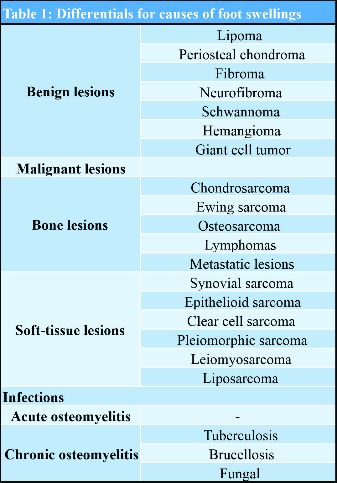Diagnosis of a swelling or fungating growth of the foot in a child can be a diagnostic challenge. Acute as well as chronic osteomyelitis along with benign and malignant lesions can present with such a scenario which can be ruled out by clinical features, laboratory investigations, and confirmed by a tissue diagnosis. The differentials for the malignant and benign conditions are presented (Table 1).