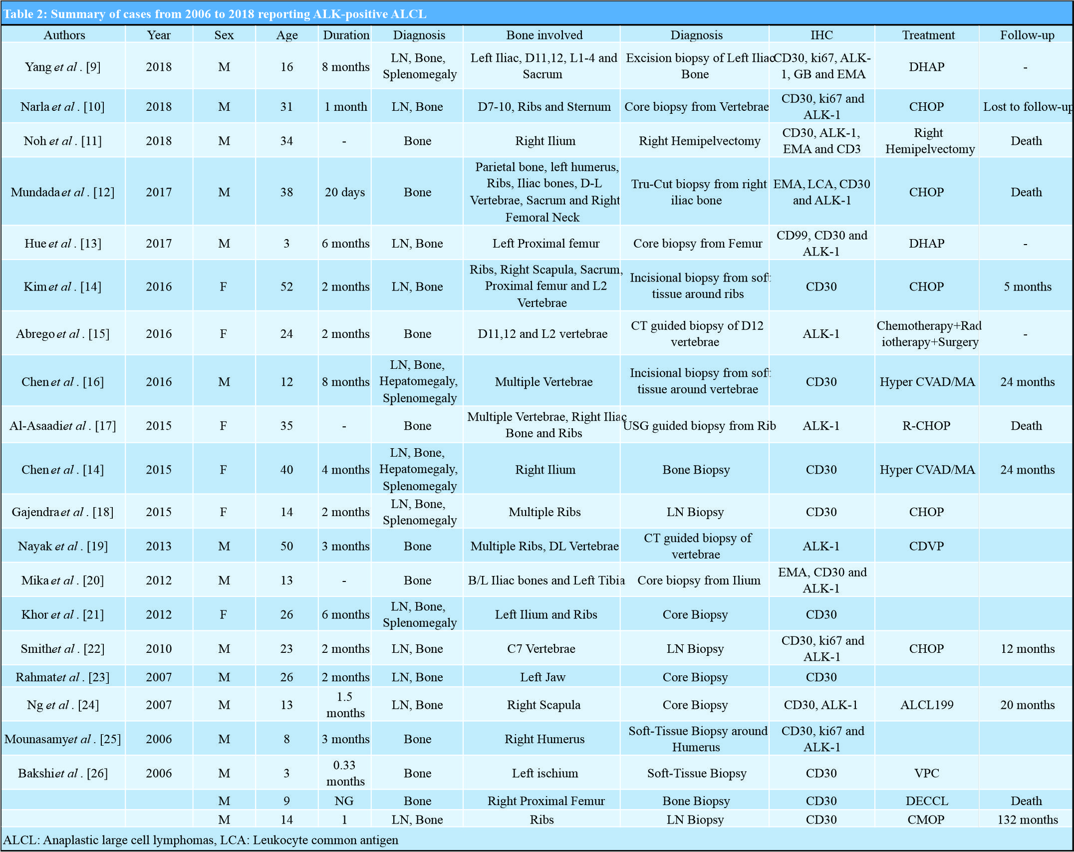 12. Mundada M, Ahmed F, Santa A. A challenging case of anaplastic large cell lymphoma with primary bony presentation. Asian J Oncol 2017;3:155-7.