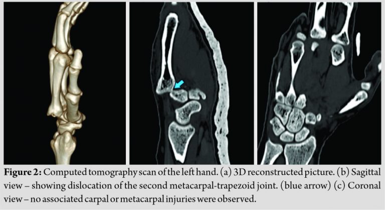 Case Report: A 32-year male information technology employee experienced a road traffic accident and developed pain, localized swelling over dorsum of the left hand. He exhibited an inability to form a complete fist with the index finger lagging behind, giving a pointing index finger like appearance. Plain radiographs showed isolated disruption of second metacarpal-trapezoid articulation. The computed tomography (CT) scans were used to confirm the absence of associated carpal injuries. The patient was managed successfully by closed reduction and Kirschner wiring. All the deformities resolved and regained normal hand functions in the follow-up period of 13 months with no recurrent episodes or evidence of arthritis.