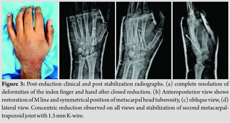 Under general anesthesia, a closed manipulation was attempted in the form of exaggerating the deformity and maneuvering a gentle distally directed force over the dislocated second metacarpal base which reduced with clunk and resolution of the deformities (Fig. 3a). The concentric reduction was attained and the articulation stabilized with a 1.5 mm Kirschner wire (K-wire) passed percutaneously under fluoroscopy guidance (Fig. 3b-d).