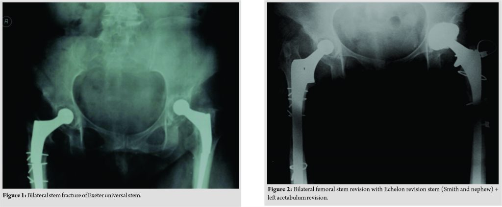 Seventeenyears ago, a45-year-old lady was admitted to our hospital due to coxarthrosis secondary to developmental hip dysplasia. In six months interval, she underwent bilateral THA with Exeter™ Universal Hip system. She had re-operated on her 3rd year because of right femoral stem fracture.Since then, she has beenexamined at the outpatient clinic regularly on1-year-based intervals. Onher last follow-up, the physical examination revealed minimal pain on her right thigh and nothing more. The patient was 1.62 m tall and weighed 84 kg, with abody mass index (BMI) of 31.25kg/m2 (obese class).There was no difference between the range of motion of bilateral knees and hips when compared withprevious records. The patient’s gait was observed adequately, and nothing significant was detected. There was no trauma or obvious activity experienced. Radiographs of the pelvis and bilateral femur were obtained,and it was demonstrated that both femoral stems were broken (Fig. 1). It was also revealed that radiolucent lines had seen both femoral stems and left acetabulum.The patient was informed of the fact that this asymptomatic situation requires revision surgery. With the informed consent of the patient, revision surgery was scheduled. Both thefractured stems were removed by extended femoral osteotomy via a lateral approach.Intraoperative examination revealed that the right acetabular component was well-fixed but there was a loosening of the left acetabularcomponent.Acetabularrevision was performed to the left side. Echelon cementless revision hip system (Smith and Nephew) was used for the right and left sides (Fig. 2). Patient was stood–up on the first post-operative day and weight – bearing was permitted as much as tolerated. . At the end of 6 weeks, full weight bearing was permitted. She returned to her routine daily life activities after 4 months. The preoperative Harris score was 90.25, and the postoperative Harris score was 91.25. After 2-year follow-up, no major or minor complications were reported.