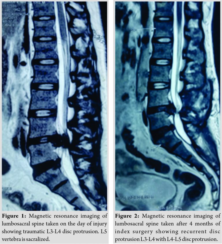 A 33-year-old gentleman came to our emergency department with a history of accidental fall from a ladder of about 10 feet height. Clinically, the patient had motor weakness in L4, L5, and S1 myotomes on the left side. There was no sensory deficit. Magnetic resonance imaging (MRI) revealed traumatic L3-L4 disc protrusion (Fig. 1). On the next day itself, L3 laminectomy with L3-L4 discectomy was done. The patient was discharged on the 5th post-operative day (POD) and was advised periodical follow-up. However, the patient did not review for a period of 4 months. At the end of 4 months, he presented with back pain and bilateral foot drop (L>R). MRI (Fig. 2) revealed recurrence of disc protrusion at L3-L4 level along with L4-L5 disc protrusion.