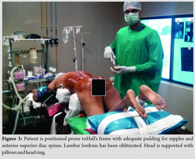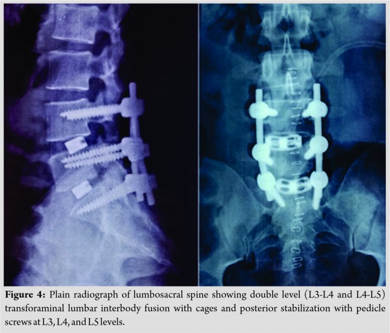 We performed revision spine surgery. With the patient placed prone to Hall’s frame (Fig. 3) with head ring for the face, under general anesthesia by extending the incision over the previous scar, L4 laminectomy, pedicle screw stabilization of L3, L4, and L5 levels, discectomy at L3-L4 and L4-L5 levels, and double level transforaminal lumbar interbody fusion with cages at L3-L4 and L4-L5 levels (Fig. 4) was performed. Surgery was uneventful and so was extubation. The amount of blood loss was calculated to be 1500ml and duration of anesthesia was 5.5 h. Immediately after extubation, on the operating table itself, the patient was questioned regarding his vision. The patient had complete loss of vision in the left eye. Pupillary reflex was absent. Examination of the right eye revealed normal vision. A diagnosis of post-operative vision loss (POVL) was made and a single dose of inj. hydrocortisone succinate 100mg was administered intravenously.