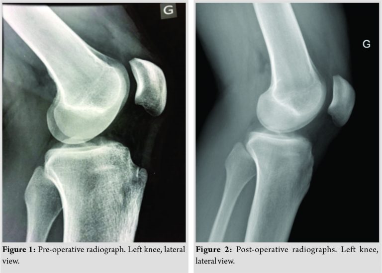 A 20-year-old patient initially presented with a long duration of anterior knee pain which was worse on kneeling, squatting, walking downhill, and also in sports participation (snowboarding). The patient underwent tibial tuberosity exostectomy through a midline incision at another institution and had excellent initial pain relief. Pre-operative radiographs (Fig. 1) demonstrated a prominent tibial tuberosity but no other pathology. Post-operative radiographs demonstrate the appearances after tibial tuberosity exostectomy (Fig. 2).
