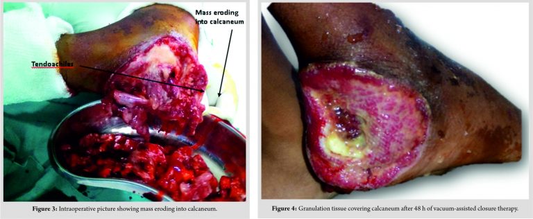 The initial two core biopsies were non-confirmatory, one of which showed features of acute inflammation with no evidence of malignancy. Aerobic, non-aerobic, or fungal cultures were negative. The swelling increased in size and turned into a fungating mass with sloughs hanging from the surface within 2-week duration after the presentation (Fig. 1). An excisional biopsy of the swelling finally showed features suggestive of non-Hodgkin’s lymphoma. The tumor mass was found to be eroding into the posterior aspect of calcaneum with the involvement of the insertion site of tendoachilles (Fig. 3).