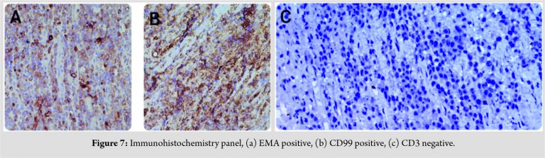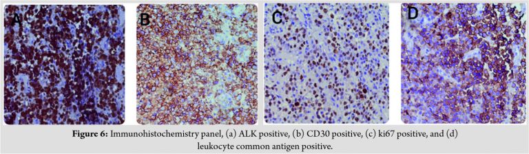 Immunohistochemistry showed ALK, CD30, CD99, EMA, ki67, and leukocyte common antigen positivity (Fig. 6 and 7).