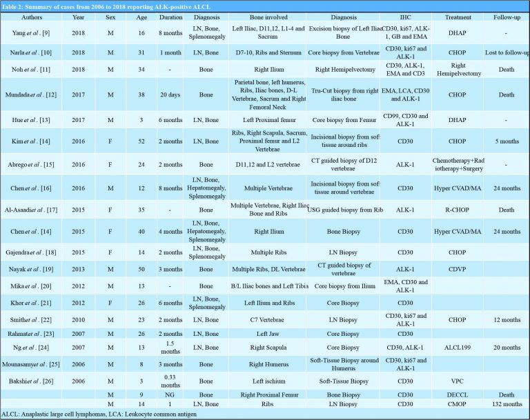 - 10. Narla SL, Kurian AJ, Subramanyan A, Parameswaran A. ALK-1 positive anaplastic large cell lymphoma presenting as extensive and exclusive osseous involvement: Report of a rare association and review of literature. J Clin Diagn Res 2018;12:ED01-3. [Google Scholar]
