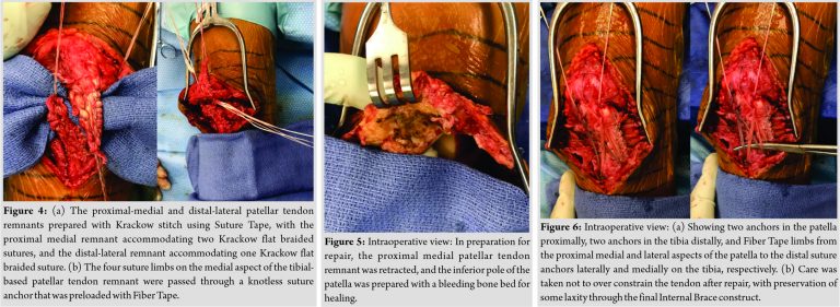 Our goal for developing a repair technique was one that allows for aggressive post-operative ROM and strengthening while limiting the post-operative immobilization period. In addition, we sought to demonstrate an ideal surgical repair technique for the proximal medial, distal-lateral tear pattern that is most commonly seen in PT ruptures post-BPTB graft harvest for ACL reconstruction, as was seen in our patient. Our preferred method for PT repair after BPTB graft harvest for ACL reconstruction is a Krackow suture fixation of the medial, tibial based PT with a knotless suture anchor to the patella, and a Krackow suture fixation of the lateral, patella based PT with a knotless suture anchor to the tibia. We also utilized Tiger Tape and Fiber Tape for Internal Brace augmentation. Our preferred surgical technique bypasses the common complications that are reported in literature regarding the tear pattern, use of transosseous tunnels, wire or autograft augmentation, and knotted anchor pull out.