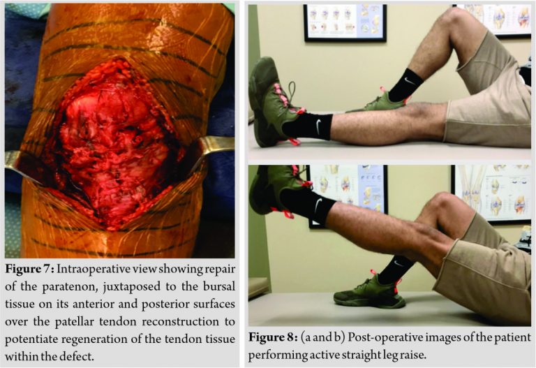 While there exists a multitude of techniques for the repair of native PT disruptions, none adequately address the complicated nature of a PT rupture secondary to post-operative complications from a BPTB graft harvest for ACL reconstructions. Most of the reported cases are described in the early post-operative period of 0–6 weeks; however, there are rare occurrences of injury years after ACL reconstruction [10]. For PT ruptures in the early post-operative period, there lies a significant risk of interrupting and delaying a patient’s rehabilitation which can compromise the overall outcome of the initial ACL reconstruction. This constitutes the necessity for a PT rupture reconstruction method that allows for aggressive rehabilitation in the post-operative period. Most of the PT ruptures after BPTB graft harvest for ACL reconstructions are seen to have occurred in the first 10 months after surgery [7,10]. Of note, a majority of the ruptures described in literature occurred after a Marshall/MacIntosh procedure in which a wide portion of the prepatellar retinaculum is excised along with the central-third portion of the PT [7,9]. This method may lead to decreased vascularization or direct damage to the remaining PT attachments [7,9]. While there have been reported cases of atraumatic PT ruptures after an ACL reconstruction with central-third PT graft harvest, a majority of cases are related to some form of minor trauma such as direct impact, hyperflexion injury, or forceful quadriceps contraction. The quality and quantity of the remaining PT tissue with which the donor site defect heals are important in determining the remaining strength of the tendon [7]. Repair methods in regard to the soft tissue defect include repairing both the PT and the paratenon defects; repairing only the PT defect; repairing only the paratenon defect; or leaving both the PT and paratenon unrepaired [8]. The paratenon is juxtaposed to the bursal tissue on its anterior and posterior surfaces, and thus exhibits the potential to regenerate the tendon tissue within the defect [7]. The surgical technique that we describe for a proximal medial, distal-lateral repair includes surgical repair of the paratenon. There have been many studies in the recent literature regarding the closure of the PT defect after BPTB graft harvest for ACL reconstruction. Histologically, the tissue growth in the non-reconstructed defect does not resemble normal tendon, but rather scar tissue made of poorly oriented collagen fibers [7,8]. Aggressive scar tissue reaction with disorganized collagen networks may be secondary to exposure of the original tendon substance to stresses leading to overproduction of repair tissue and remodeling of the cross-sectional area [7]. While defect closure may reduce the size of the gap, and therefore scar reaction, the closure has also been noted to be adversely affective to the remaining tendon. The tension in the defect closure may result in avascular degeneration, focal necrosis, and calcification of the proximal remaining tendon, which leads to an increased risk of PT rupture [9]. The techniques reported for the reconstruction of a PT rupture after its central-third has been used for ACL reconstruction, include simple suture of the avulsed PT, suture with augmentation with a semitendinosus and gracilis tendon, and a fascia lata autograft [13,14]. In a recent retrospective study by Benner et al., patients with PT rupture secondary to ACL graft harvest were surgically repaired by employing a novel suture anchor technique with Dall-Miles Cable augmentation through the patella and tibia [13]. The authors propose that their technique prevents shortening of the PT, with cable augmentation allowing for early mobilization, immediate ROM, and avoidance of complications from patella baja and subsequent loss of knee flexion. However, augmentation with Dall-Miles Cable may not be the ideal approach to repair, as these cables may break and must be removed through an additional surgical procedure 6–8 weeks postoperatively [10,13]. Repairs of the tendon to the bone may also be augmented with dacron sutures, neutralization wires, cerclage wires, autogenous semitendinosus grafts, and fascia lata strips [10]. In a report by Miroslav et al., BPTB frozen allograft with multiple-wire loop reinforcement was used for reconstruction [14]. The authors secured the donator allograft into the central aspect of the defect where the previous graft was harvested and secured it with two screws. They then ran wire loops from the upper edge of the patella to the tibial tubercle to reinforce the repair, and the remnants of the patellar ligament were sutured. However, as a reported complication with the Benner et al. study, wires and screws had to be removed 6 months post-operation due to breakage. Another disadvantage to use of allografts is the possible risk of disease transmission, infection, and delayed allograft incorporation [14]. Hardin and Bachaugmented PT repair post-BPTB graft harvest for ACL reconstruction with semitendinosus and gracilis tendon autografts [15]. Disadvantages of autograft utilization for PT reconstruction include donor site morbidity, delayed mobilization, and delayed achievement of full ROM [14]. Hardin and Bach also utilized wire augmentation for their autograft reconstructions, which again runs the risk of complications from wire breakage [15].