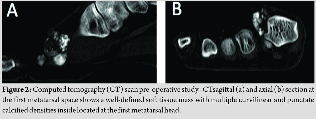 Examination confirmed a tender fixed mass on the dorsal aspect of the first webspace with slight swelling and no temperature or skin changes. The range of motion of the metatarsophalangeal joint was complete, although movement was painful in all positions. The rest of the examination was unremarkable. Plain radiographs of the foot showed multiple oval ossified lesions adjacent to the lateral side of the first metatarsal head in the first webspace, with bone remodeling of the first metatarsal head and a preserved joint line (Fig. 1). Computed tomography (CT)scan showed a multiple lobulated soft tissue mass with curvilinear calcification around the head of the first metatarsal (Fig. 2).