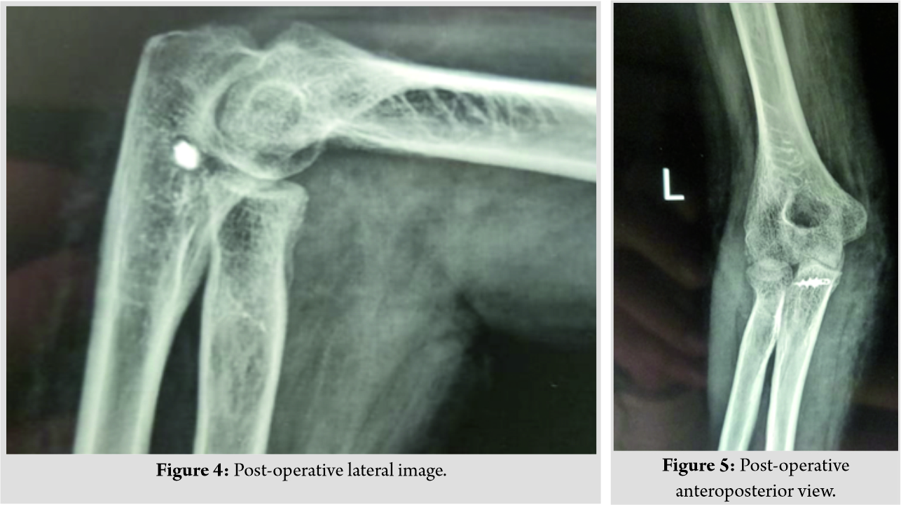 The first step was to identify and preserve the ulnar nerve through a direct medial approach. (Fig. 2) shows the scar site of the medial incision taken. In situ neurolysis of the ulnar nerve was performed between the Osborne fascia and arcade of Struthers. The contacted posterior capsule was excised and the fibrous tissue between the ulnohumeral joint which was blocking the reduction was excised completely, taking care not to damage the cartilage of the joint. Medial collateral ligament (MCL) complex and the flexor mass were found to be completely torn and contracted. Triceps muscle shortening was dealt with complete release and pie-crusting of the muscle subperiosteally. The wound was kept open to allow observation of tension in the ulnar nerve during open reduction and distraction. Next, Kocher’s interval was accessed to enter the lateral part of the joint through a separate lateral incision. (Fig. 3) shows the scar site of the lateral incision through which the Kocher’s interval was accessed. The annular ligament was found to be torn and contracted. The anterior capsule was released and the fibrous tissue was removed. The lateral collateral ligament (LCL) was found to be intact, released subperiosteally, and arthrolysis was done laterally. Open reduction of the elbow joint was done and the elbow stability was assessed. The annular ligament was repaired with triceps fascia (Bell-Tawse procedure) with adequate tension and checked intraoperatively for restriction of pronosupination. MCL was reconstructed with triceps fascia turndown from the medial side and fixed with 2.7mm suture anchors on sublime tubercle after forming a posterior to anterior drill hole tunnel. The sutures along with the fascia were fixed back to the medial epicondyle, thus forming a triangular-shaped stable reconstruction of the MCL. The ulnar nerve was left in cubital tunnel with an adequate cover around it. The post-operative radiographs are shown in (Fig. 4 and 5).