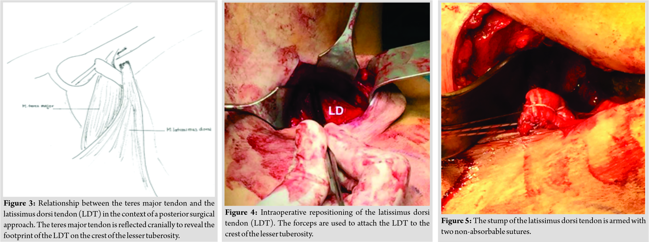 The patient was positioned in a lateral decubitus position on his left side. A mechanical arm-holder (Trimano Arthrex Inc., Naples, Florida) secured the right arm in a position of 90°abduction, neutral rotation (Fig. 2). A 10cmskin incision was made along the posterior margin of the deltoid muscle in the posterior axillary fold. After identification of the teres major muscle, the adhesions of the LDM were released and a Langenbeck retractor was inserted to lift the teres major muscle cranially to expose the insertion of the LDT (Fig. 3).Subsequently, the retracted stump of the LDT was identified and mobilized manually. A forceps was used to assess the tension of the LDT while moving it toward its insertion (Fig. 4, Video 1). Subsequently, the LDT was armed with two non-absorbable sutures (Fiber-Wire No. 2, Arthrex Inc., Naples, Florida), thus creating a proximal and a distal pair of suture limbs (Fig. 5 and 6). The crest of the lesser tuberosity was identified beneath the insertion of the teres major tendon and abraded to a bleeding surface with a rasp. The free ends of each paired suture were passed through the 12-mm tension slide button (Distal BicepsButton, Arthrex Inc., Naples, Florida) in an alternating fashion. After drilling two 3.2-mmmonocortical holes with a distance of 3 cm into the insertion of the LDT, the proximal and the distal button were inserted with the provided inserter. Pulling on the suture limbs flipped both monocortical buttons, thus preparing the tension-slide reinsertion of the LDT (Fig. 6). Afterward, the suture limbs were pulled tight and secured with seven half hitches for each button. After the procedure, the LDT showed an optimal attachment to its insertion.