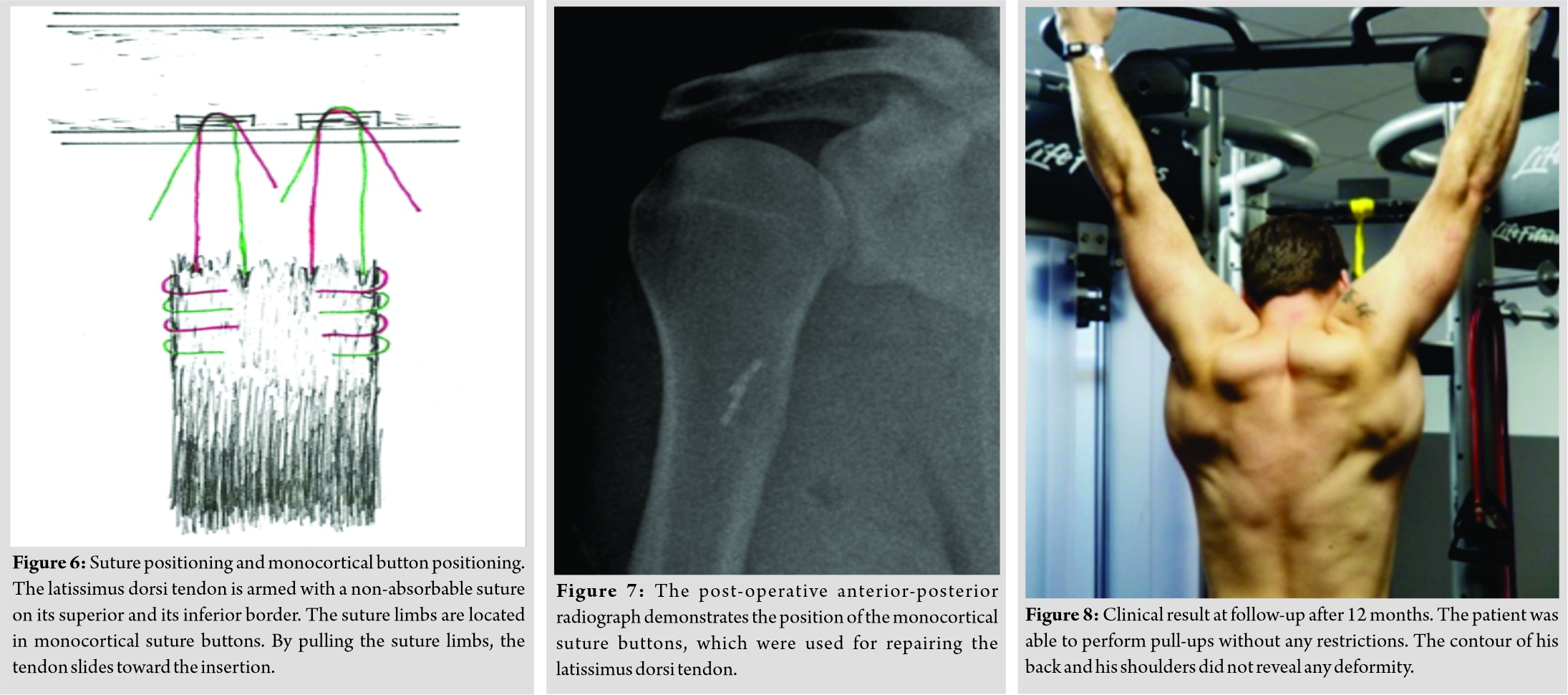 The latissimus dorsi muscle (LDM) is a large flat muscle originating from the mid to the lower back. The insertion of the latissimus dorsi tendon (LDT) is located at the crest of the lesser tuberosity of the proximal humerus posterior to the pectoralis major tendon and anterior to the teres major tendon. The most important functions are adduction, extension, and internal rotation of the shoulder. The LDM is strongly involved and trained during horizontal and vertical pulling exercises such asrowing and pull-ups. During exercises stressing the LDM, isolated ruptures of its tendon are possible. The bar muscle-up exercise (BMU) is a combination of a pull-up exercise and a dip exercise.The athlete hangs on a bar and combines both exercises in a swinging motion starting with the pull-up exercise. The LDT isgreatly stressed during this particular CrossFit exercise. Few case reports have dealt with traumatic tears of the LDT. Both surgical treatment and conservative treatment have been reported (1, 2, 3, 4, 4, 5, 6, 7, 8, 9).This is the first case report about a CrossFit athlete with an acute LDT tear who was operated using a minimal-invasive posterior approach in combination with tension-slide suture buttons.