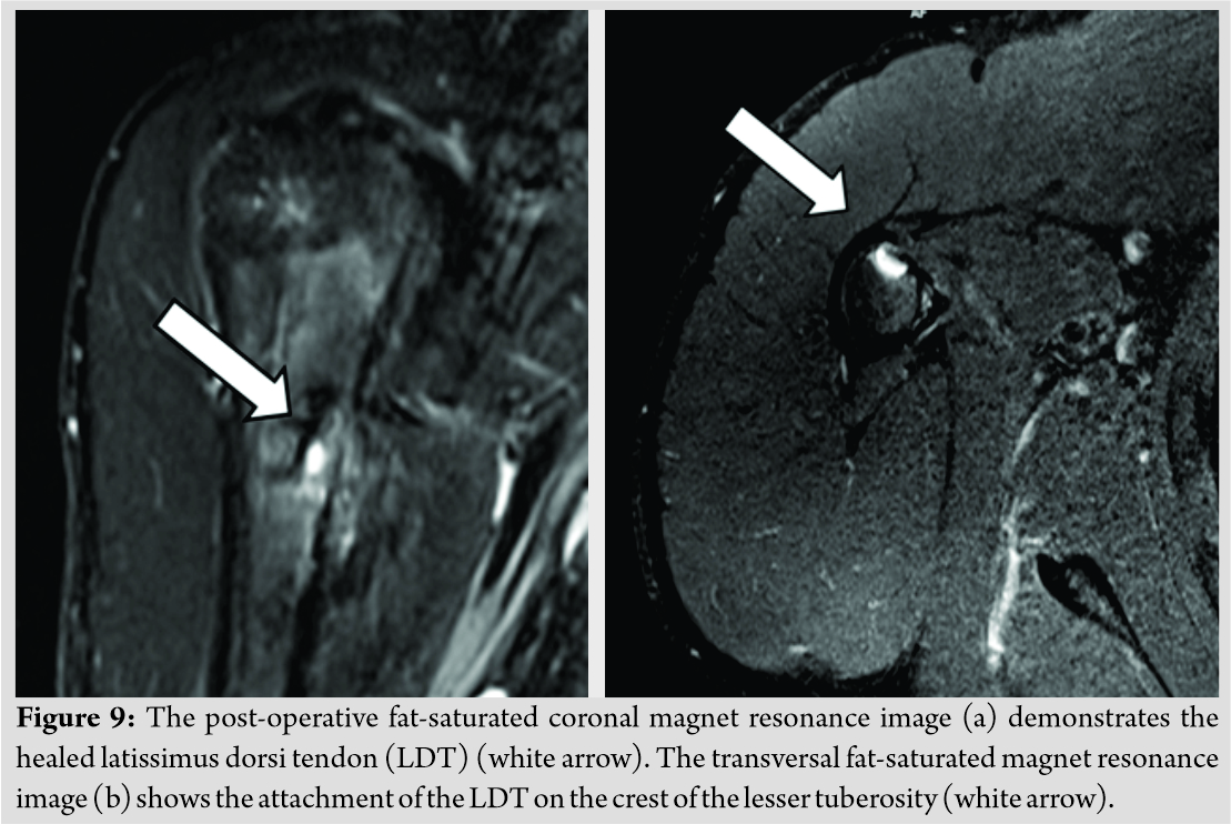 Preoperatively, the injury was assessed in coronal and transversal MRI scans. The images revealed a complete tear of the LDT tendon, while the rotator cuff, the teres major tendon, and the pectoralis major tendon were intact. The maximum retraction of the tendon in relationship to the crest of the lesser tuberositiy rated 8 mm. Fluid around the tear site could be observed in fat-saturated MRI sequences. Pre-operative MRI scans are presented in Fig. 1a-c.