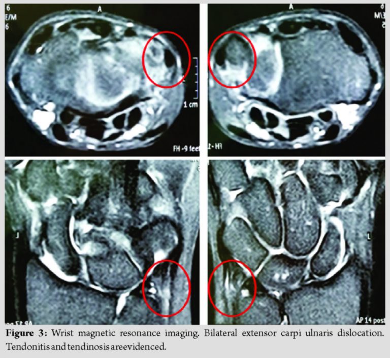 The patient’s initial assessment included visual analog scale (VAS), Quick-Disability of the Arm, Shoulder, and Hand (Q-DASH), and the modified American Shoulder and Elbow Surgeons (m-ASES)scores. VAS for wrists and elbows happened to be 7 and 5, respectively. Pre-operative Q-DASH and m-ASES scores were 33 and 45, respectively. Plain radiographs were performed with no pathological findings. A magnetic resonance imaging disclosed bilateral ECU dislocation together with tendonitis and tendinosis (Fig. 3).